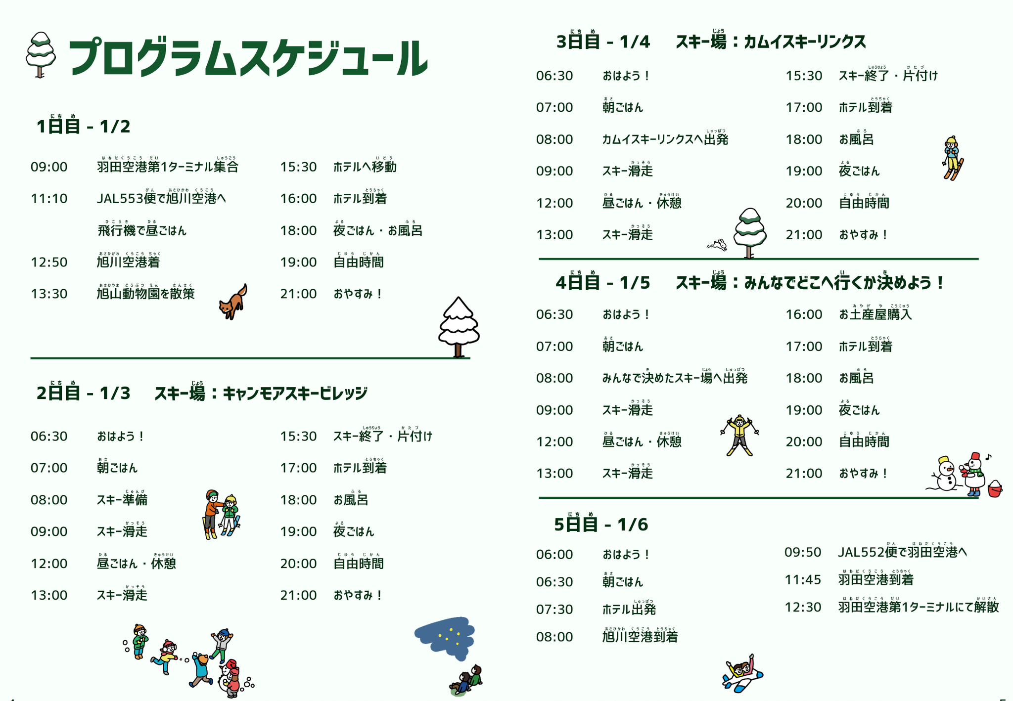| 代金に含まれるもの | 宿泊費、移動費、食事代(1日目昼食〜5日目昼食まで計13食、リフト代、旅行保険 |