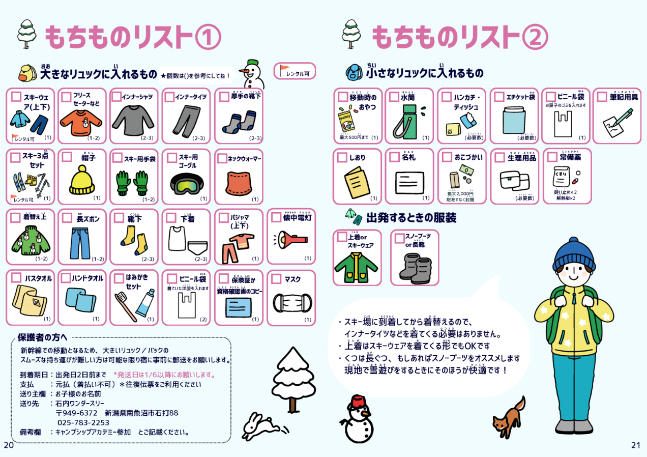 - しおり送付時に保護者向けの持ち物リストも同封致します。