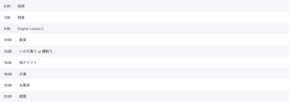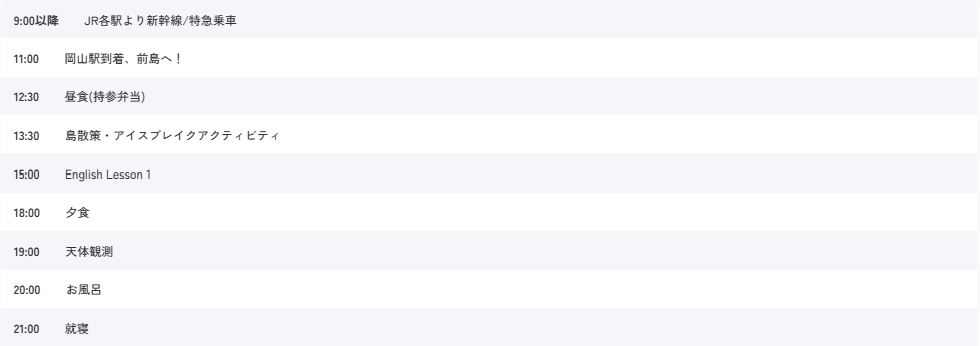 | 代金に含まれるもの | 宿泊費、移動費、食事代(1日目夕食〜3日目昼食まで計6食)、 各種アクティビティ代、旅行保険 |