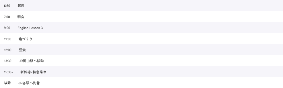 | 復路列車 | *出発前確定書面にて確定情報をご連絡いたします <暫定スケジュール> 1. 新大阪駅・姫路着 - ひかり516号あるいは前後列車に乗車予定 (1) 岡山駅発:15:36 (2) 姫路駅着:16:07 (3) 新大阪駅着:16:46 2. 高松駅着-快速マリンライナー43号あるいは前後列車に乗車予定 (1) 岡山駅発:15:42 (2) 高松駅着:16:36 3. 新山口・広島駅着 - こだま855号あるいは前後列車に乗車予定 (1) 岡山駅発:15:50 (2) 広島駅着:17:07 (3) 新山口駅着:17:55 |