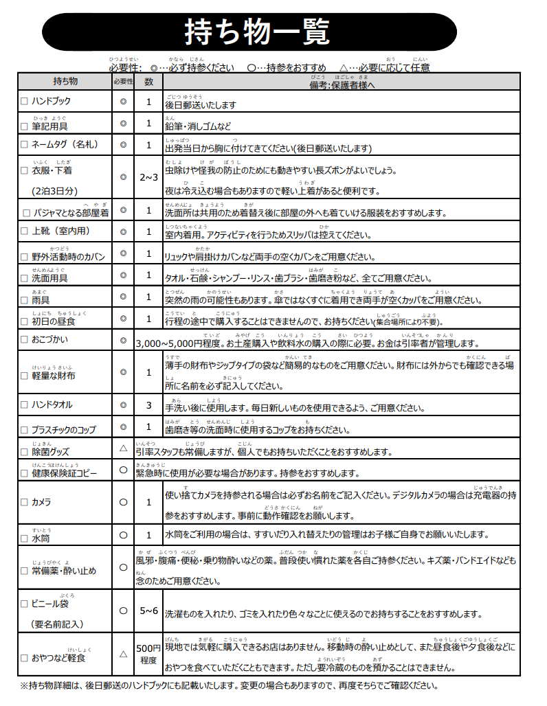 - 旅のしおりの受領(3月上旬ごろ郵送でご自宅に届きます)