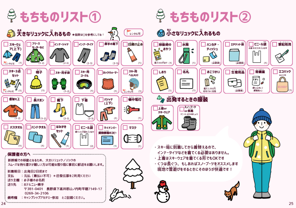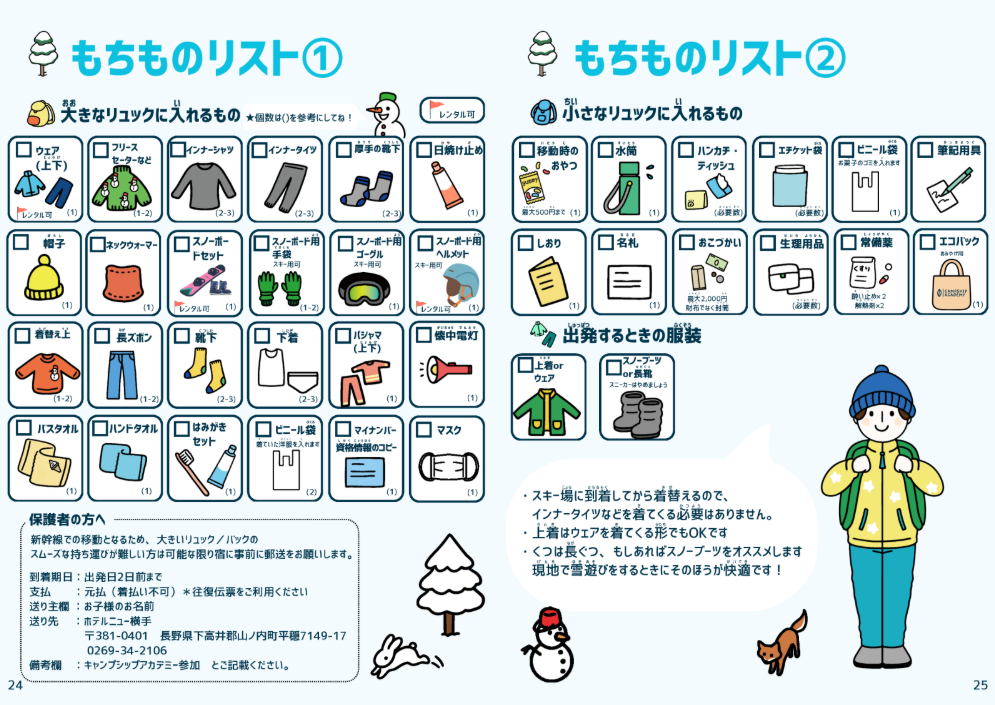- 荷物の準備はご一緒ないしはお子様一人にて実施してください。