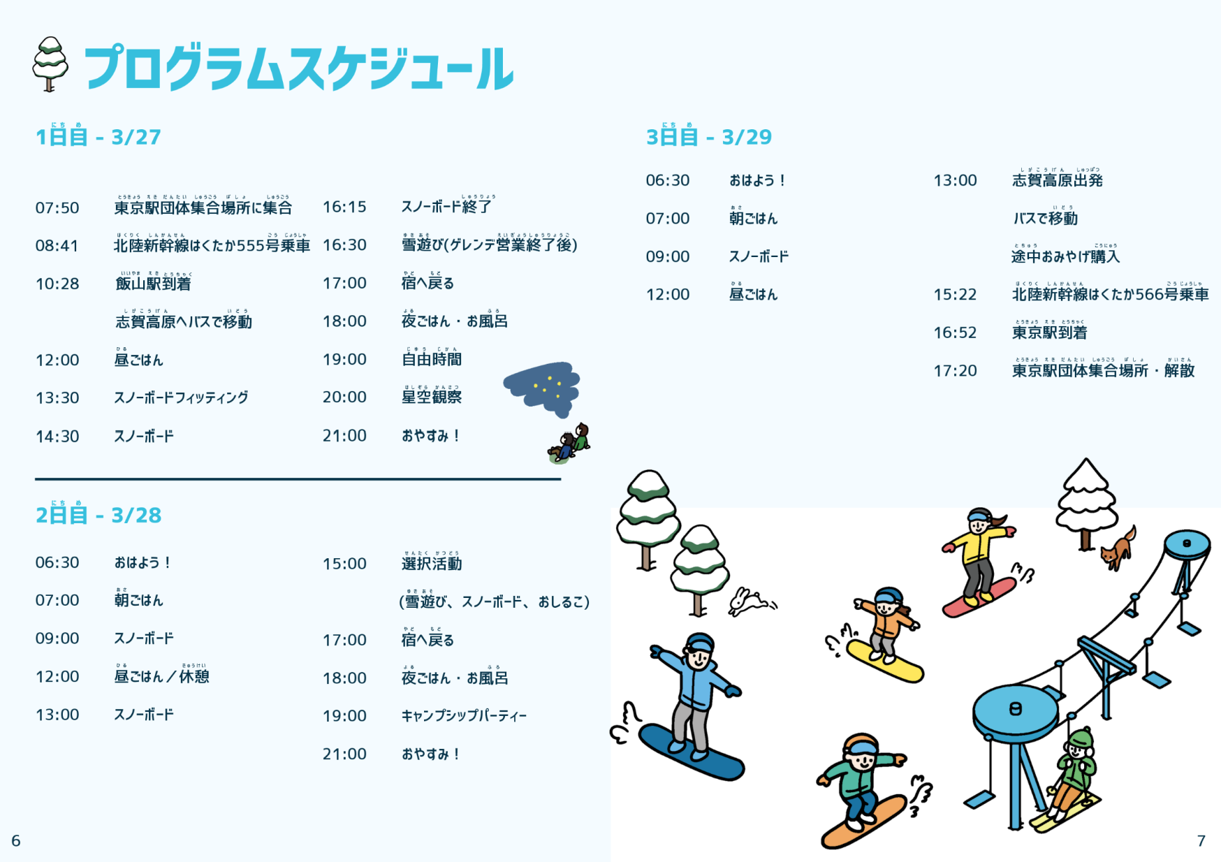 | その他 | 同日程・同宿泊場所にて開催されるスキー&スノーボードプログラムのメンバーの生活班(部屋)は同場所となります。 |