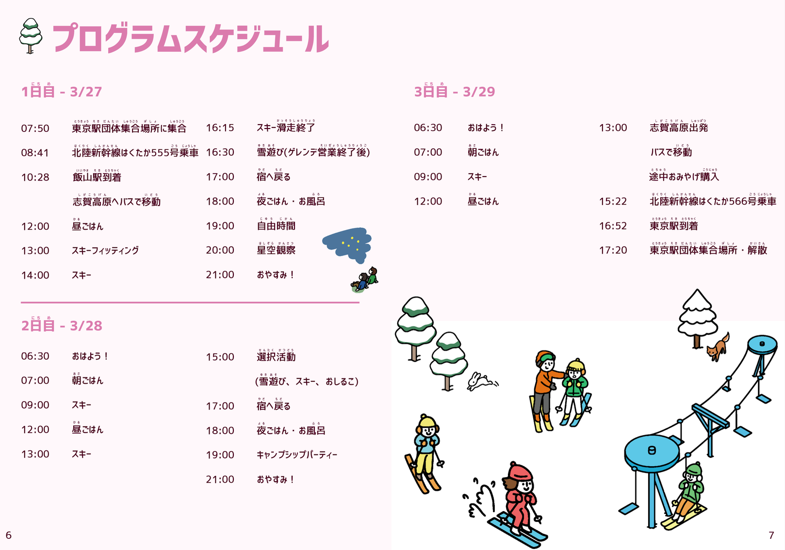 | 備考 | ・志賀高原プログラム総責任者/細田は志賀高原にてすべてのプログラムの受け入れをいたします。このため、本プログラムの往路集合及び復路解散については竹野が対応予定です。 |